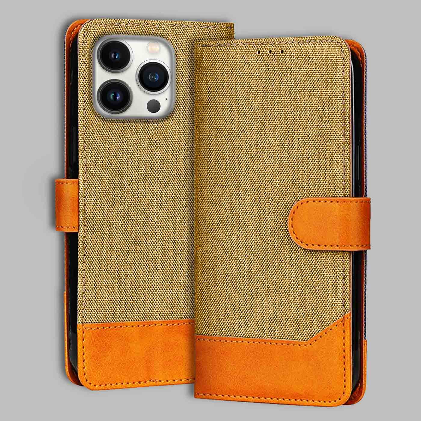 Upgrade your Apple iPhone 13 Pro with this stylish & durable denim and vegan leather flip cover!