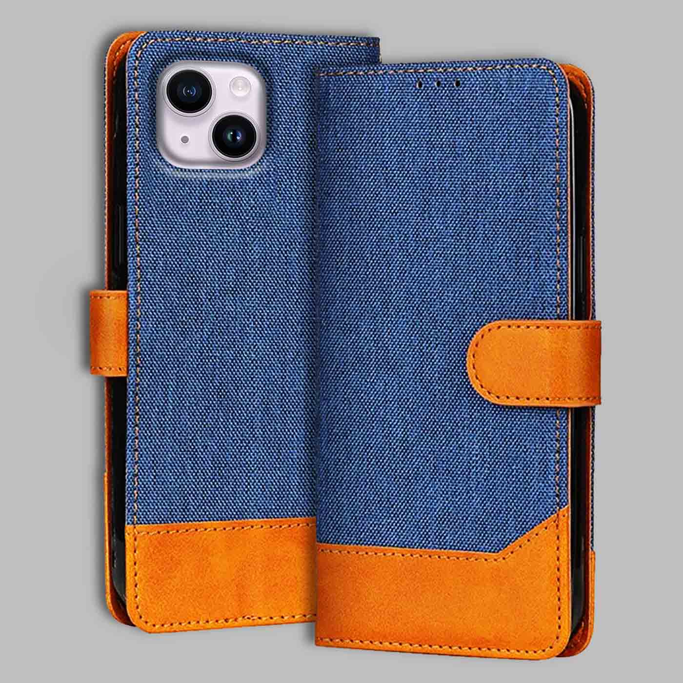 Apple iPhone 14 Denim Leather Flip Cover | Dual Color | Sleek & Durable - Blue
