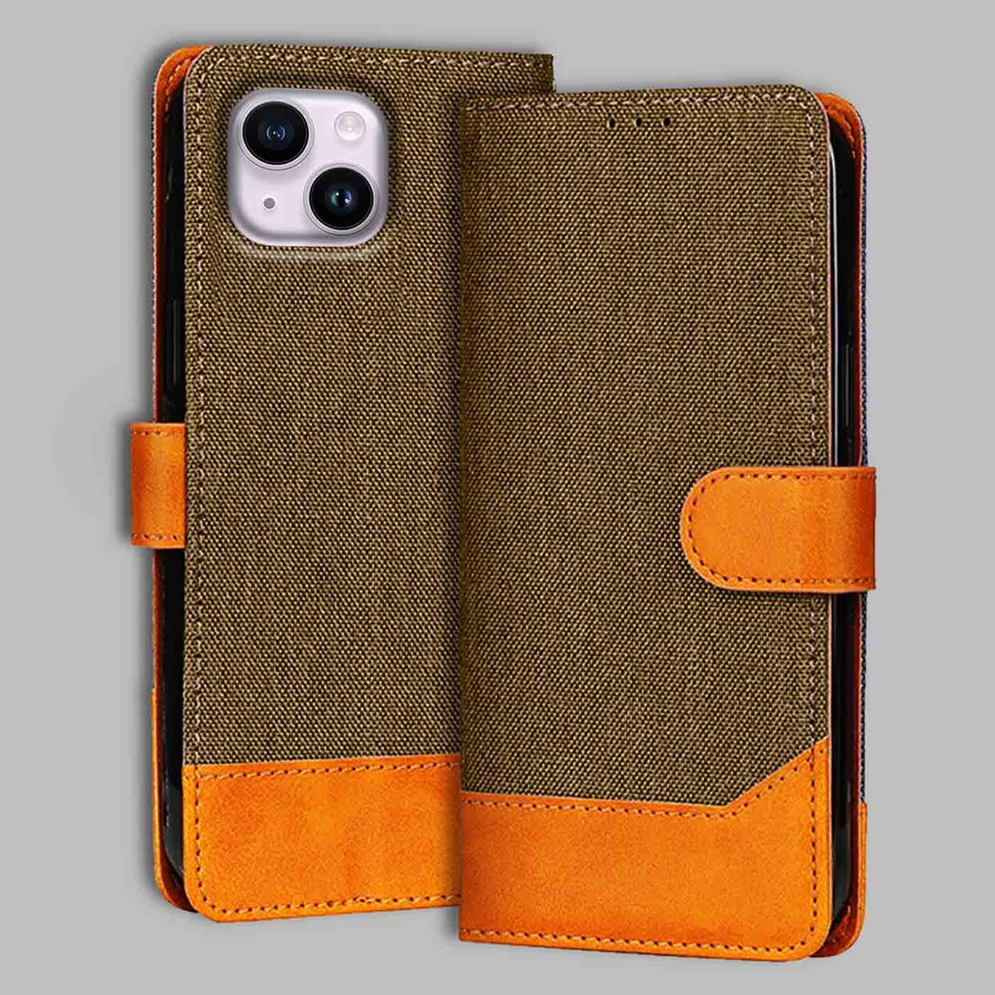 Apple iPhone 14 Dual Color Flip Cover | Denim & Leather - Dark Brown