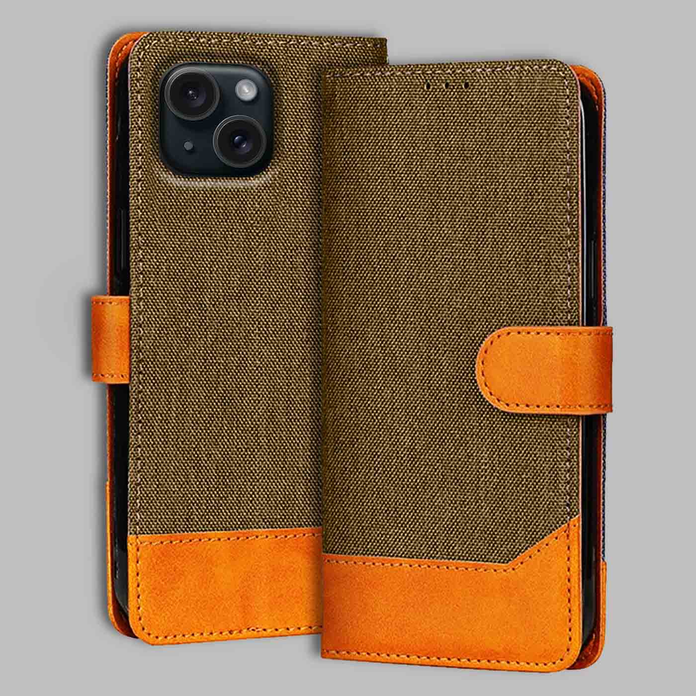 Upgrade your Apple iPhone 15 with this stylish & durable denim and vegan leather flip cover!