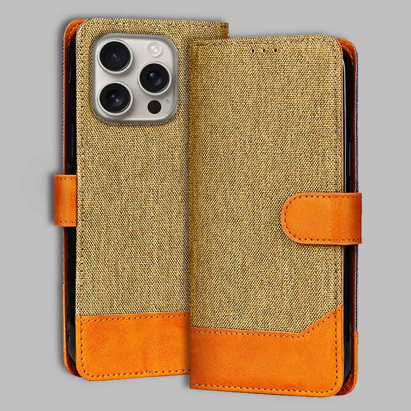 Upgrade your Apple iPhone 16 Pro with this stylish & durable denim and vegan leather flip cover!