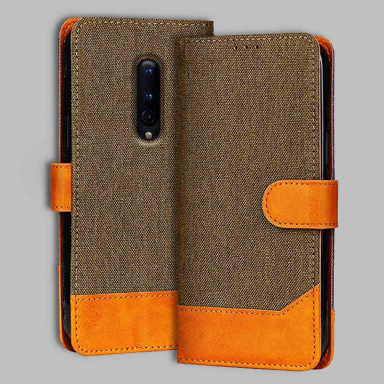 Denim & Leather Flip Case for OnePlus 8 | Stylish Protection - Dark Brown