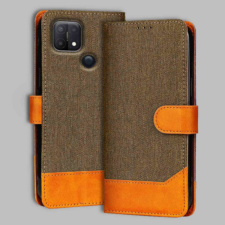 Denim & Leather Flip Case for Oppo A15S | Stylish Protection - Dark Brown