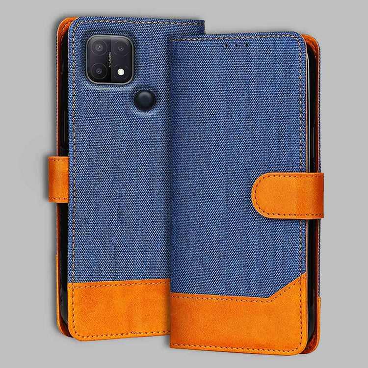 Oppo A15 Dual-Tone Denim & Leather Flip Cover - Blue