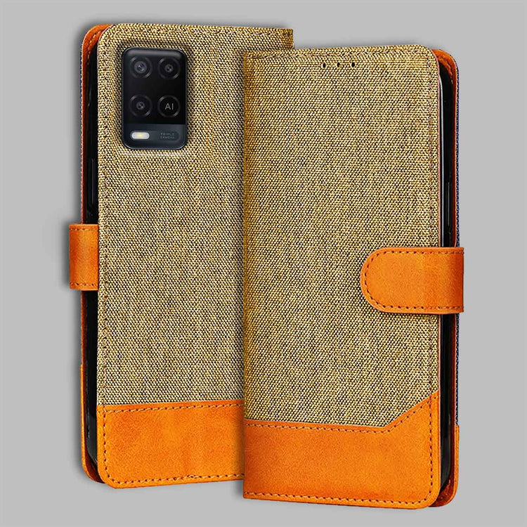 Oppo A54 Dual Color Flip Cover | Denim & Leather - Light Brown