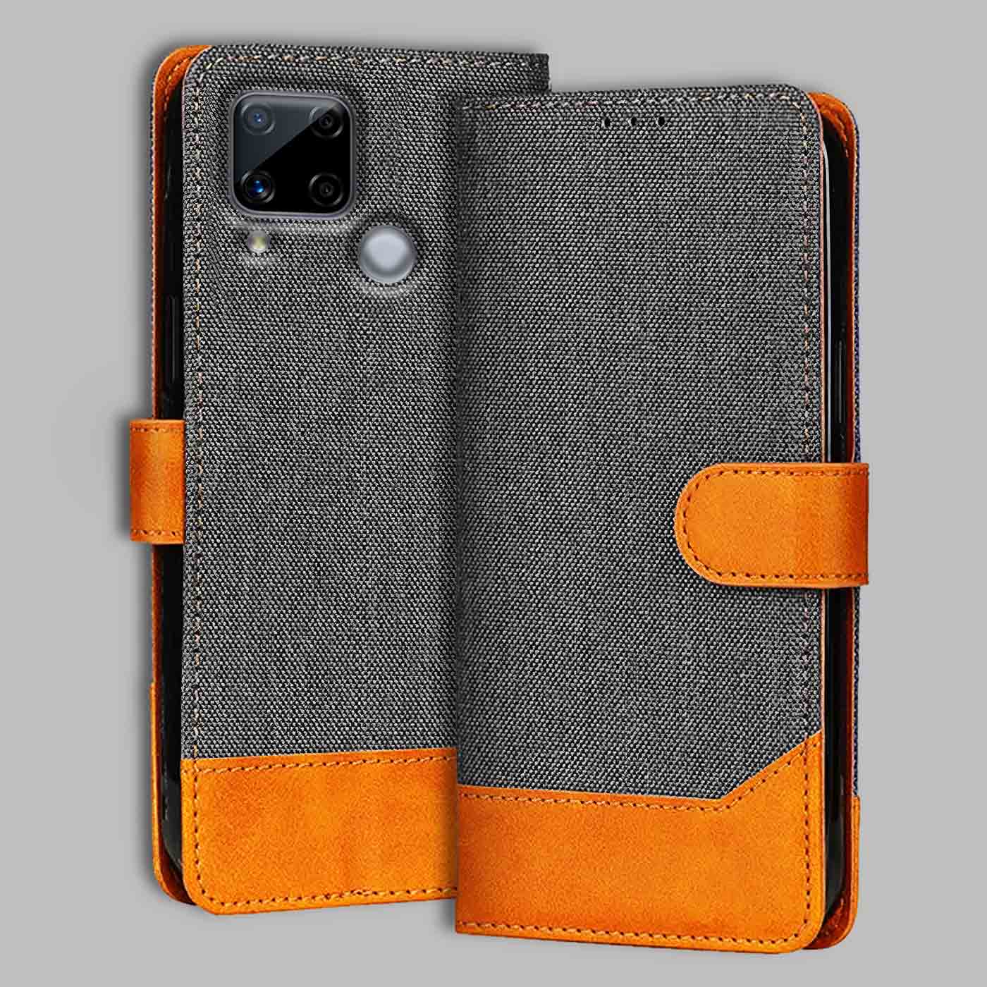 Realme C15 Denim Leather Flip Cover | Dual Color | Sleek & Durable - Grey
