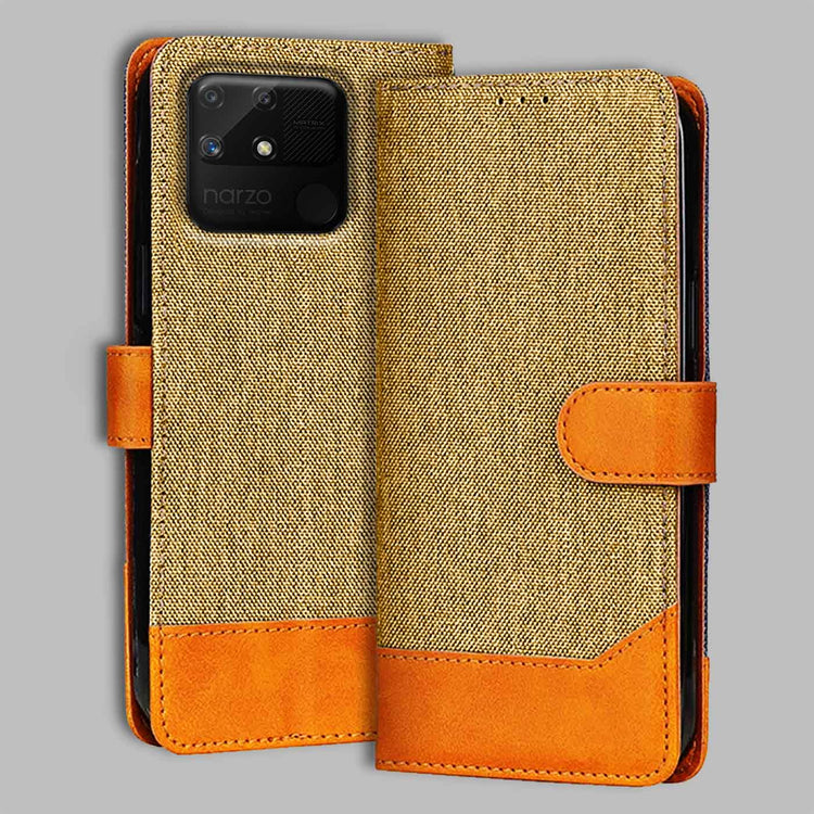 Realme Narzo 50A Dual Color Flip Cover | Denim & Leather - Light Brown