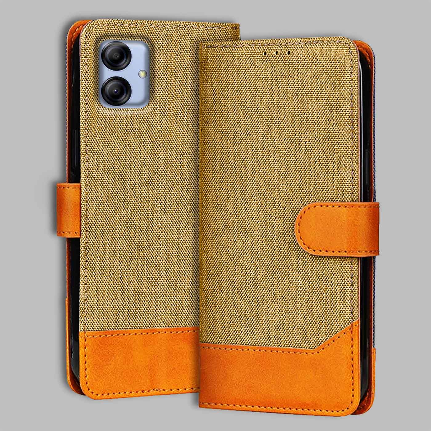 Samsung A04E Dual Color Flip Cover | Denim & Leather - Light Brown