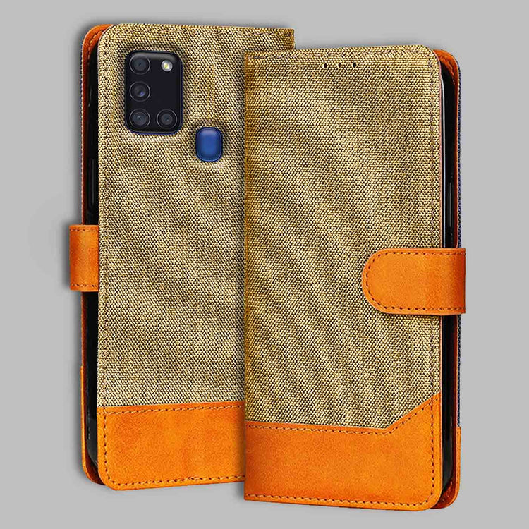 Samsung A21S Dual Color Flip Cover | Denim & Leather - Light Brown