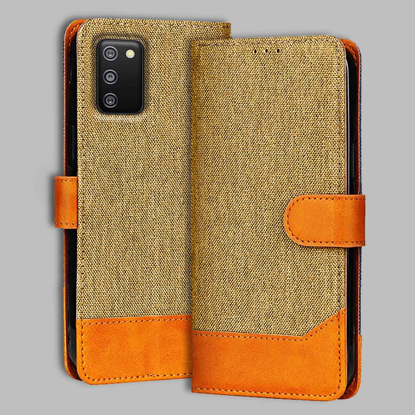 Samsung F02S Dual Color Flip Cover | Denim & Leather - Light Brown