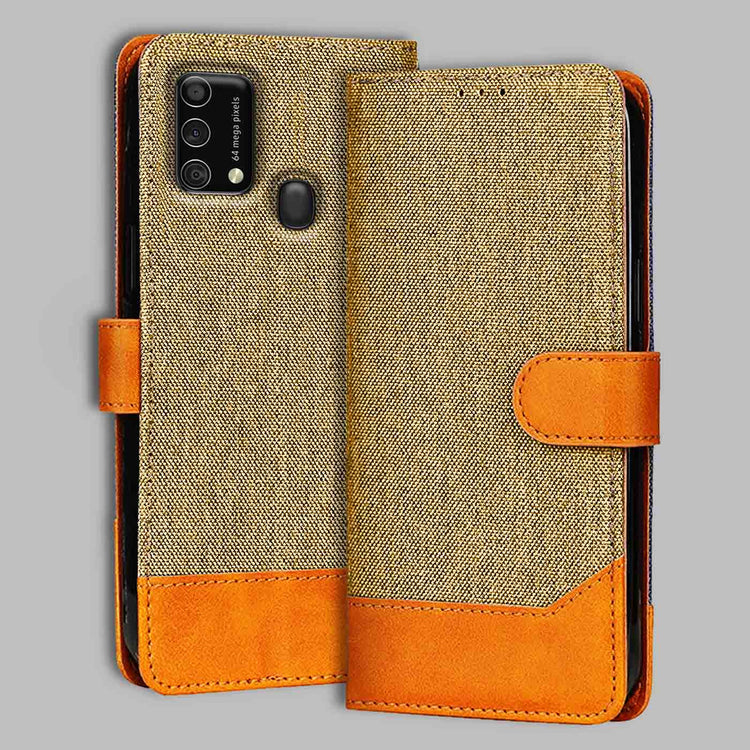 Samsung F41 Dual Color Flip Cover | Denim & Leather - Light Brown