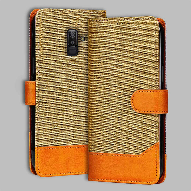 Samsung J8 Dual Color Flip Cover | Denim & Leather - Light Brown