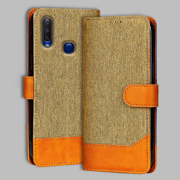 Vivo Y12 Dual Color Flip Cover | Denim & Leather - Light Brown