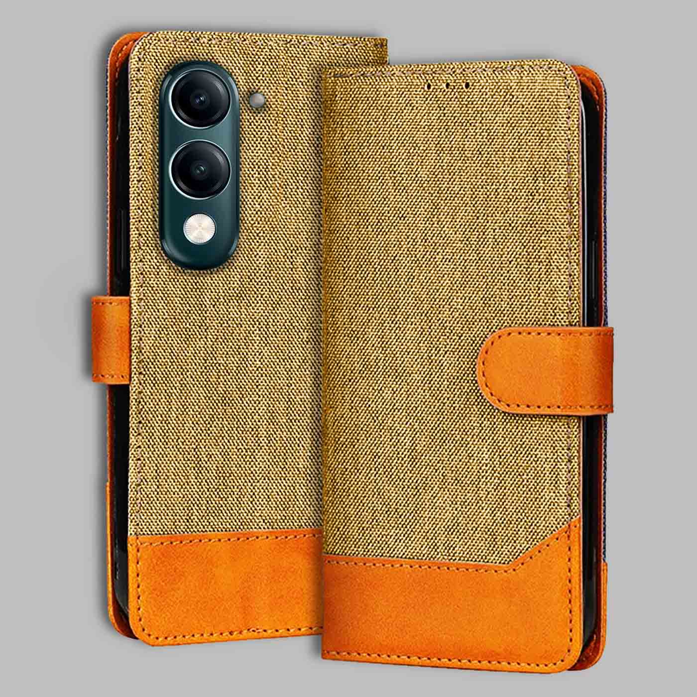 Vivo Y19 5G Dual-Tone Denim & Leather Flip Cover - Light Brown